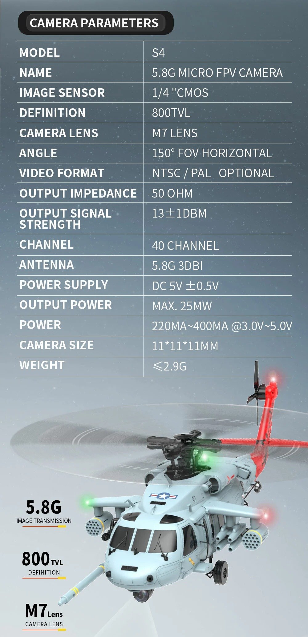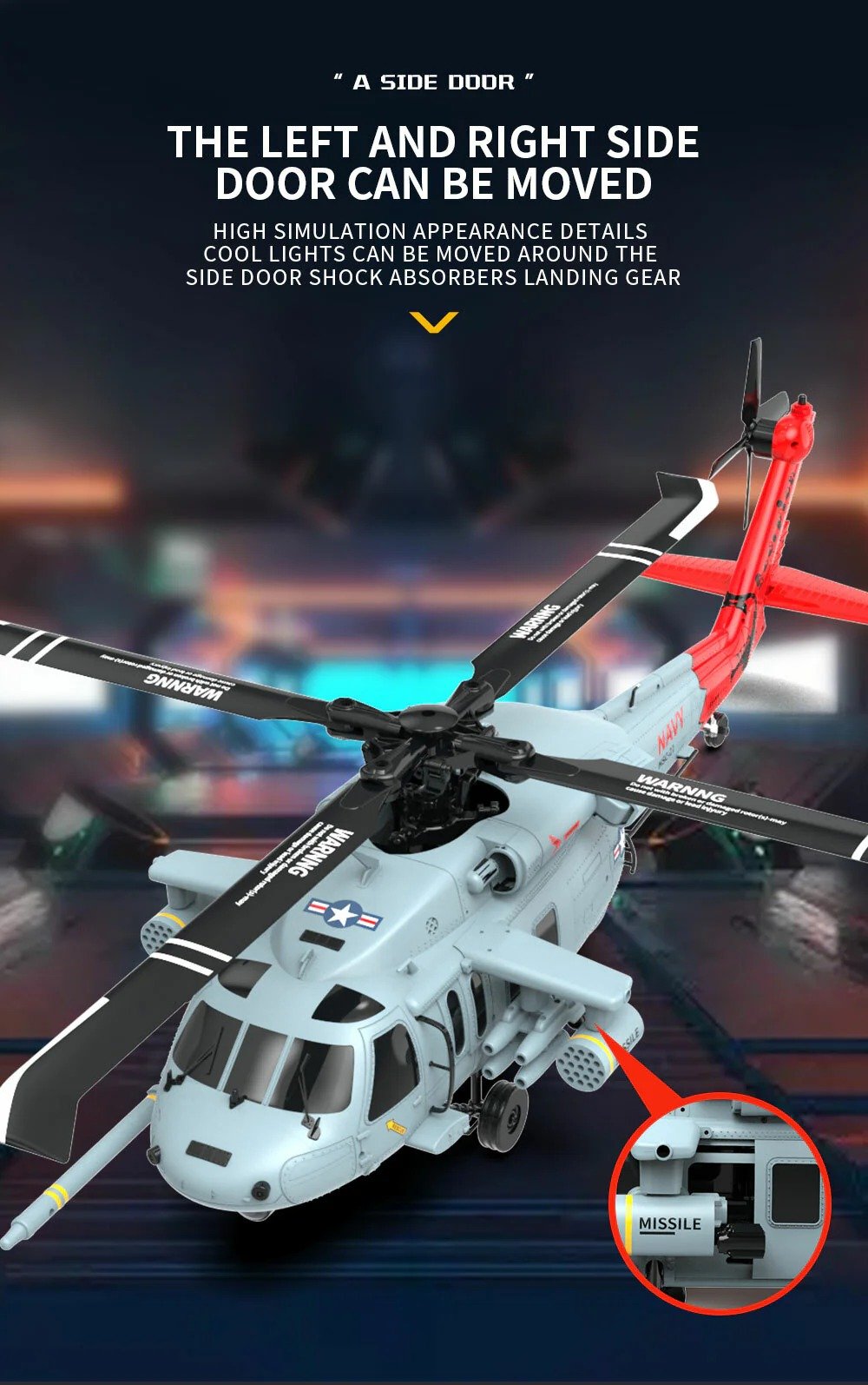 The F09H UH-60 Sea Hawk 220 Size GPS Stabilized Helicopter offers enthusiasts an exceptional flying experience with advanced features. Equipped with GPS, pressure, and optical sensors, it ensures stable flight even in windy conditions. Hassle-free operations are ensured with one-button return home and auto landing capabilities. Real-time battery status is provided by the intelligent battery's LEDs. Scale detail, including LED lights and sliding side doors, enhances its appeal.